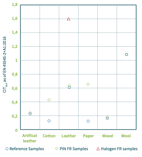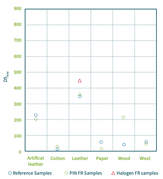 基于轨交标准EN 45545-2进行烟密度和烟毒性测试,由于烟毒性基于CO, CO2, HCN, NOx, SO2, HBr, HCl, HF气体,磷系阻燃剂天然比卤系阻燃剂有优势。基于纤维素的材料(木材、纸、棉花)散发出低水平的烟雾,显示出低毒性水平(主要由 CO 和 CO2 组成),并且可能会受到用于 这项研究。 另一方面,羊毛材料显示出低烟密度水平,而与 FR 无关。 然而,羊毛样品显示出高于平均水平的毒性,这几乎不受此处研究的阻燃剂的影响。 皮革材料根据成分(天然与合成)表现出不同的行为,由于氮和硫含量丰富,因此比纤维素基材料具有更高的毒性,并且阻燃剂对烟雾和毒性的影响和效率因不同基质而异。 这两项研究都强调了一种高度依赖于所考虑材料的性质、火灾场景以及使用的阻燃剂的火灾行为。